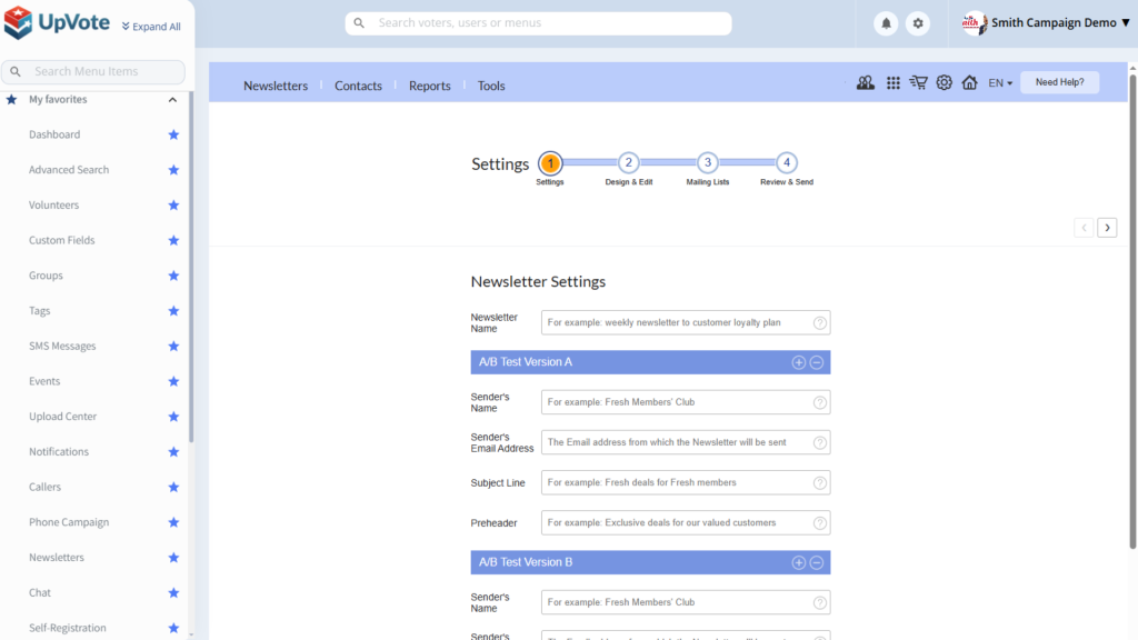 UpVote includes a built-in email newsletter tool inside the Admin Portal. Use it to design newsletters, choose a mailing list, and send campaign updates without exporting contacts to another system.