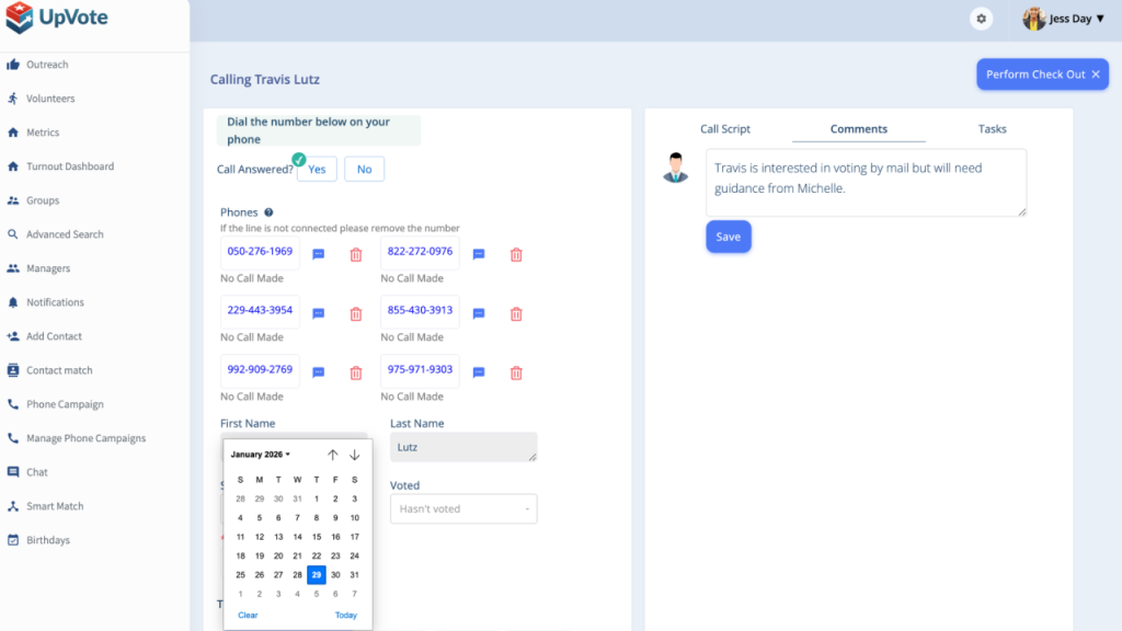 UpVote makes friend banking operational by creating a call list for each volunteer based on their own contacts, and then giving the campaign visibility into progress and outcomes.